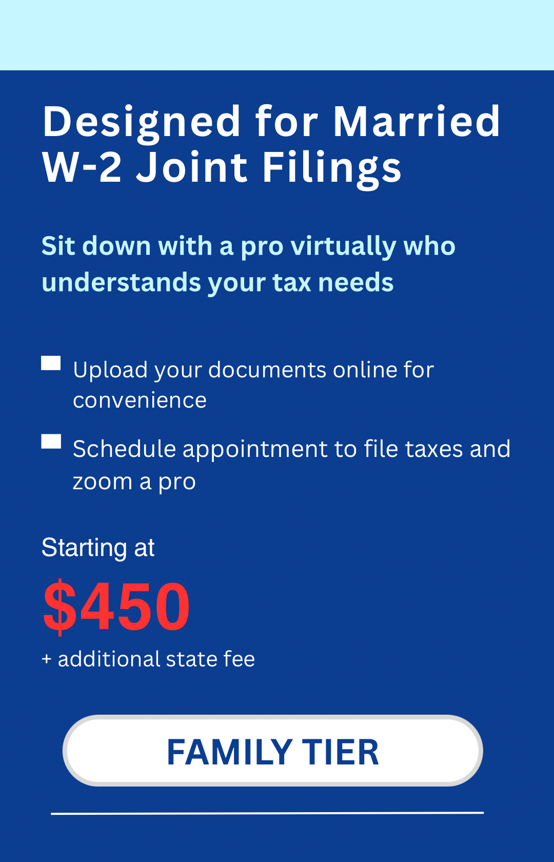 Married couples or heads of household with W-2 income and dependents, emphasizing household filings and family optimizations. If your situation is more complex, we’ll recommend upgrading to our Pro or Premium Tier during your appointment.